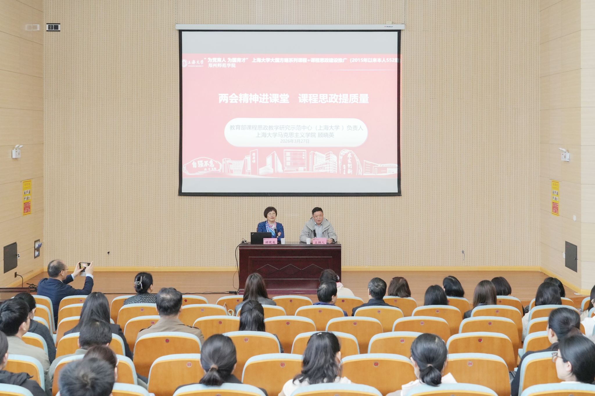 为推进立德树人工程落地,提升课程思政与思政课双向赋能质量,3月27日上午,我校特邀教育部课程思政教学研究示范中心(上海大学)负责人顾晓英教授,在嵩山学堂第二报告厅作题为“两会精神进课堂 课程思政提质量”的专题讲座。我校党委宣传部、教务处、教学质量检测与评估中心相关人员,各二级教学单位教学管理干部及马克思主义学院思政课教师到场聆听。